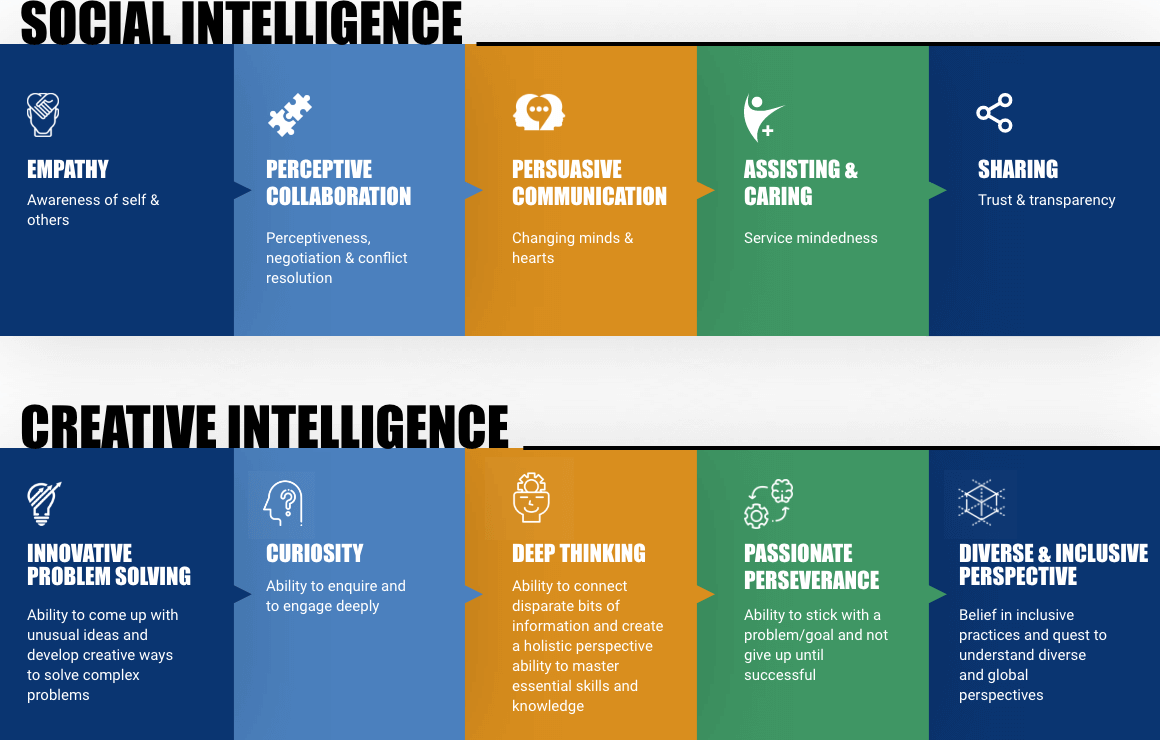 According to a survey carried out by the Oxford Martin Press (2013 Future of Jobs report), the most important skills relevant to jobs that will not be replaced by technology would be social and creative skills. When we expand some of the findings of this survey and aggregate it with some of what experts are talking about, skills that are most relevant today are: Social Intelligence and Creative Intelligence.