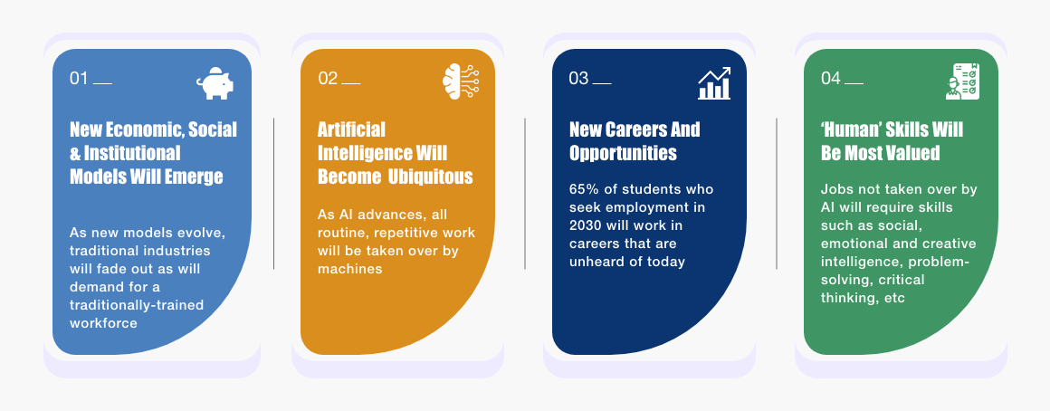 Our education system is a legacy of the First and the Second Industrial Revolutions when the purpose of education was to prepare skilled labour for the factory system. Though automation and technological advancement radically altered the way we work, play or communicate in the Third Industrial Revolution (1960- ), the purpose of education, unfortunately, has remained unchanged in our current system of teaching the young. Evidence of dramatic changes is all around us already — artificial intelligence, quantum computing, self-driven cars, genetic engineering, sharing economy, 3D printing, to name just a few. In the near future, the all-encompassing technology- and innovation-driven Fourth Industrial Revolution (2010-) will transform current social, cultural and economic structures into a new world order.