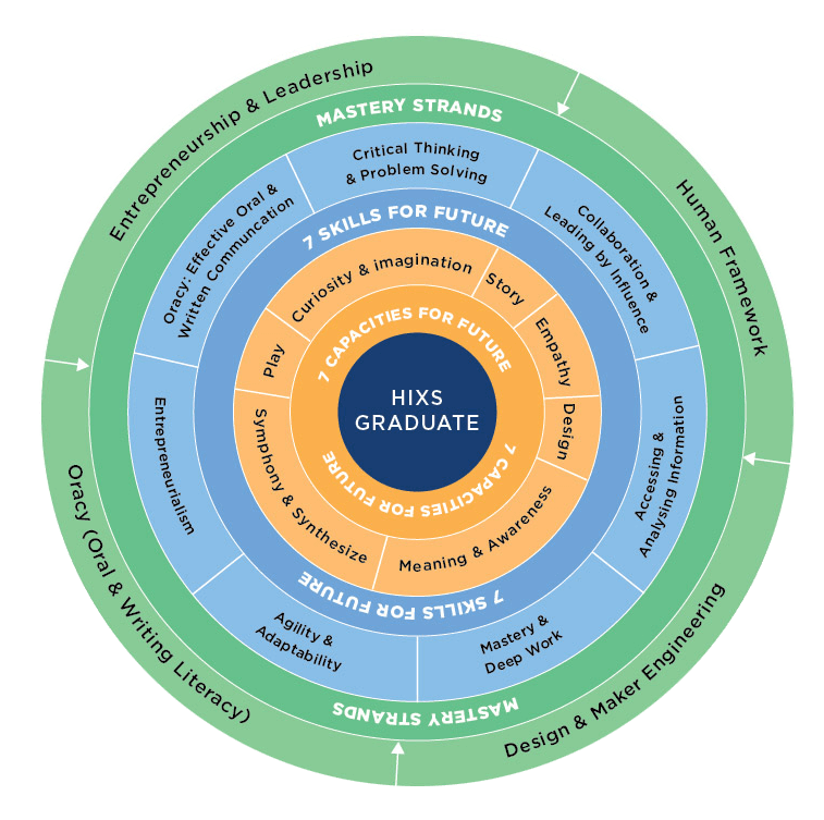 Thriving in the 21st century will require real competencies, far more than academic credentials. Students who only know how to perform well in today’s education system—get good grades and test scores and earn degrees—will no longer be able to succeed in the future economy. At Heritage International Xperiential School (HIXS), we believe every student must be empowered with the following seven capacities and seven skills. These seven capacities and skills underpin and transcend all content standards. In addition to this the core of the curriculum in HIXS is the four vertical strands that every HIXS graduate is expected to master: social-emotional learning, design thinking and maker engineering, research focused reading and writing, and citizenship. These mastery strands are the anchor curriculum to achieve the HIXS graduate profile.