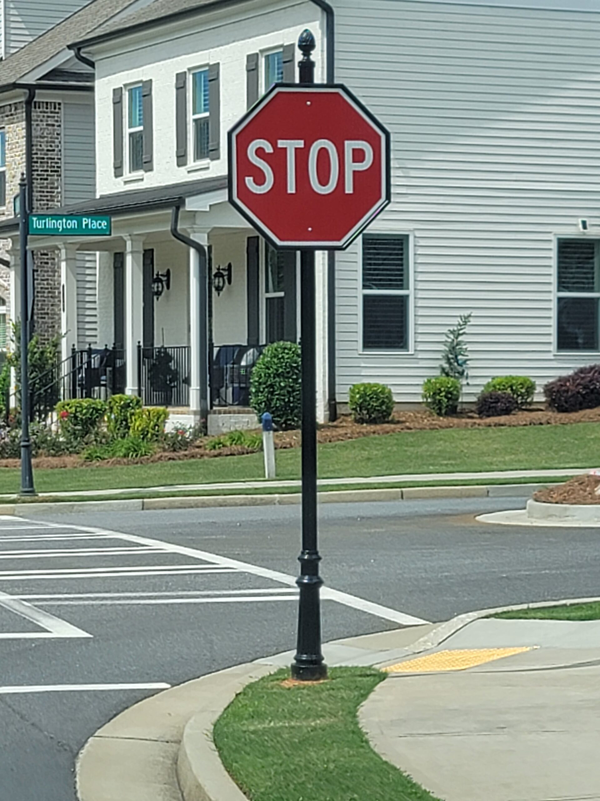 Stop Sign - An octagon-shaped red sign that requires drivers to come to a complete stop.