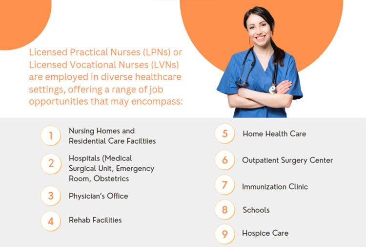 LPNs/LVNs can be found in diverse healthcare settings such as hospitals, nursing homes, clinics, and home healthcare. They contribute to patient care, assist in medical procedures, and collaborate with other healthcare professionals to enhance overall patient well-being.