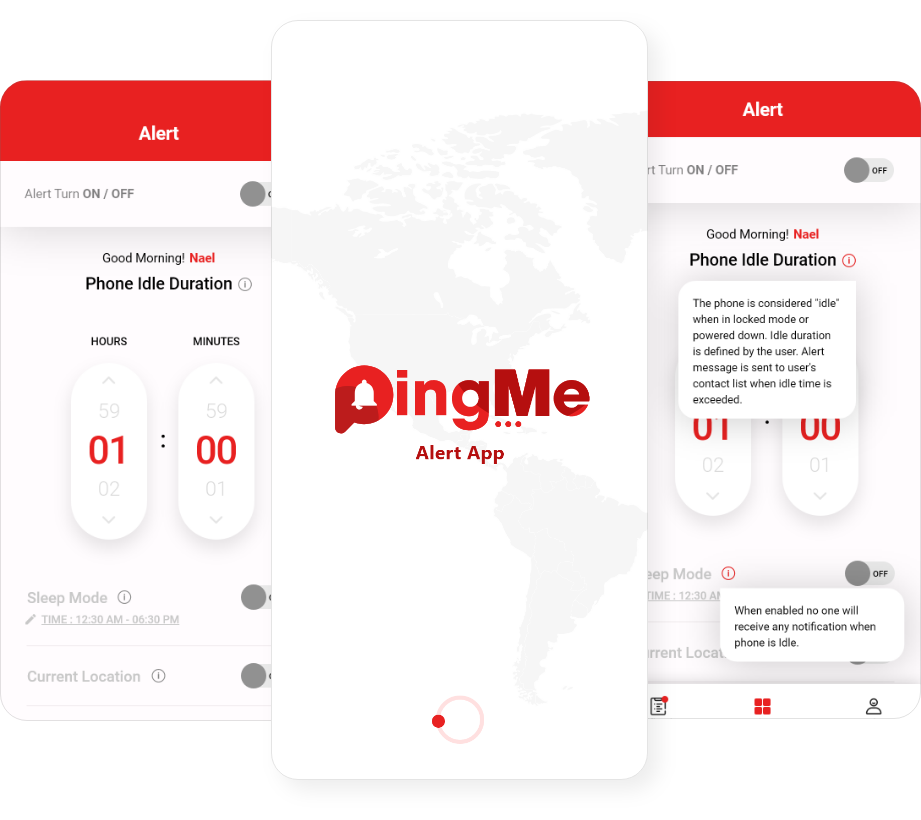 PingMe Alert App alerts the user's emergency contacts if the user's phone remains idle for a preset duration in order to trigger family/friends to promptly check on him/her, as prolonged idle time could be an indication of a serious issue that requires attention.